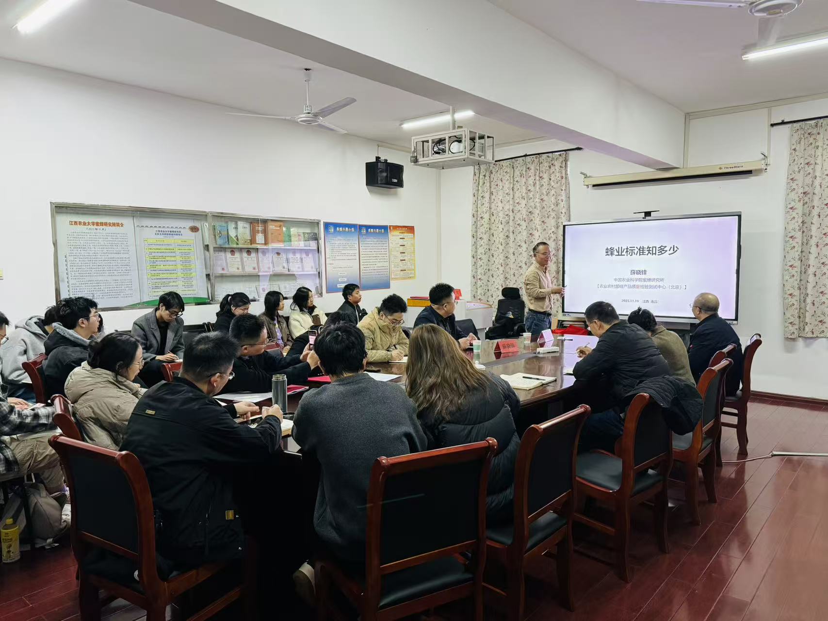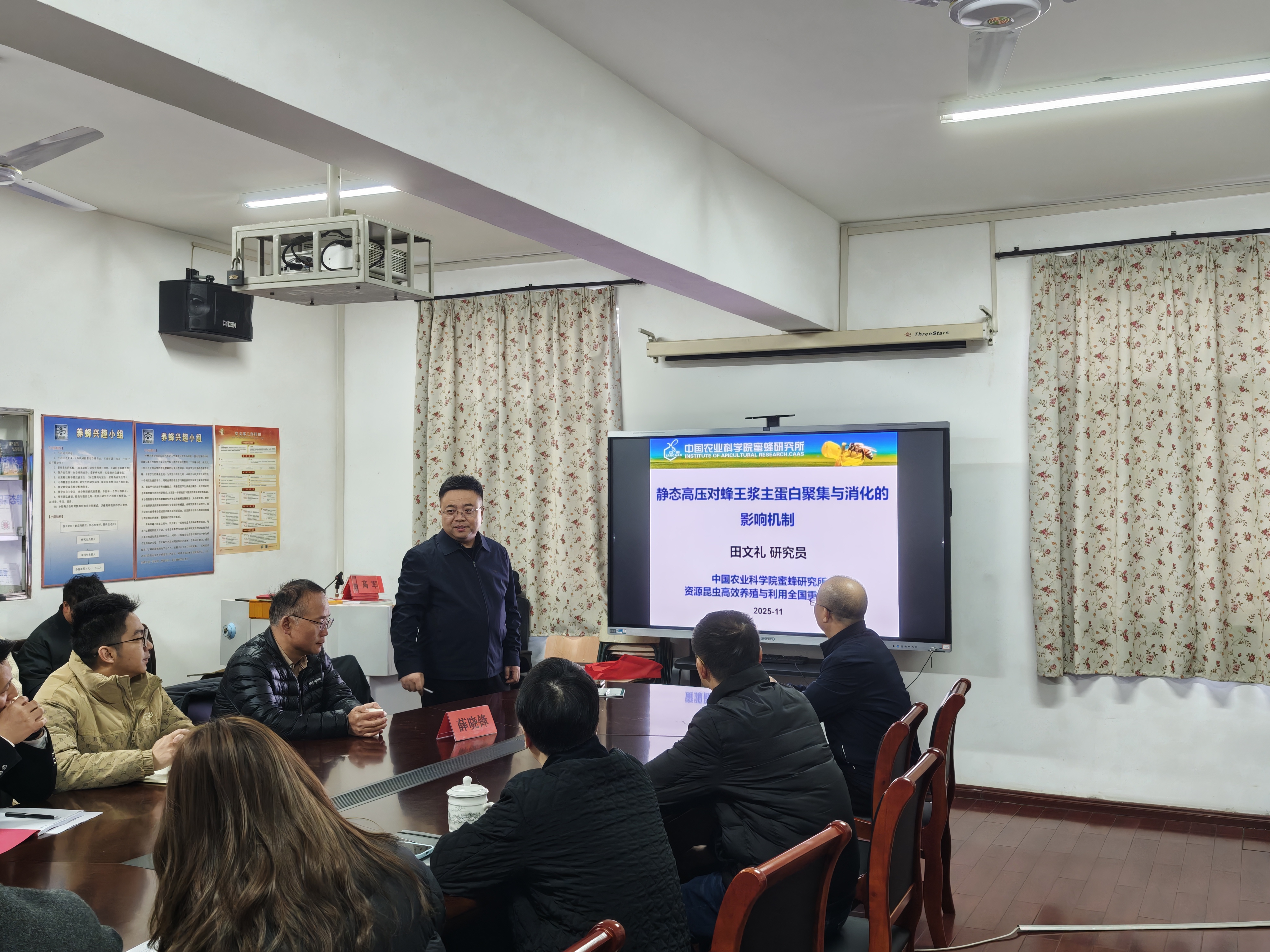 11月19日上午中国农业科学院蜜蜂研究所副所长田文礼研究员和农业农村部蜂产品质量监督检验测试中心主任薛晓峰研究员在蜜蜂所二楼会议室分别作了“静态高压对蜂王浆主蛋白聚集与消化的影响机制”和“蜂业标准知多少”学术报告。曾志将教授主持了学术报告会。